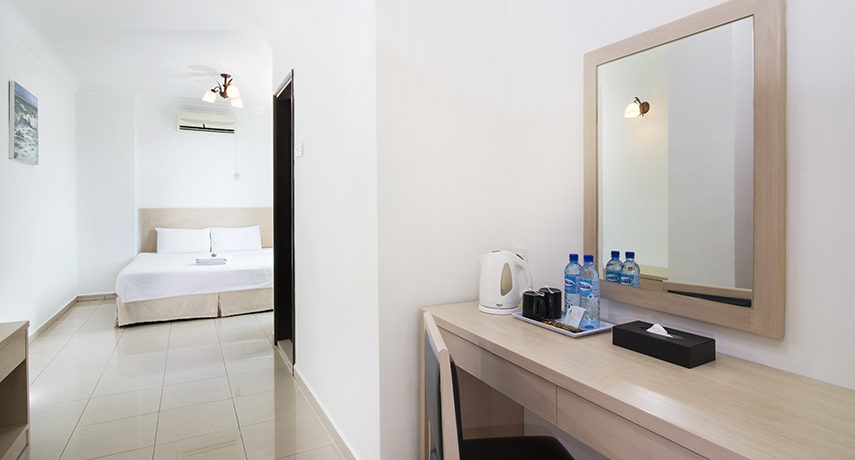 - Air minum kemasan, kopi, dan teh gratis